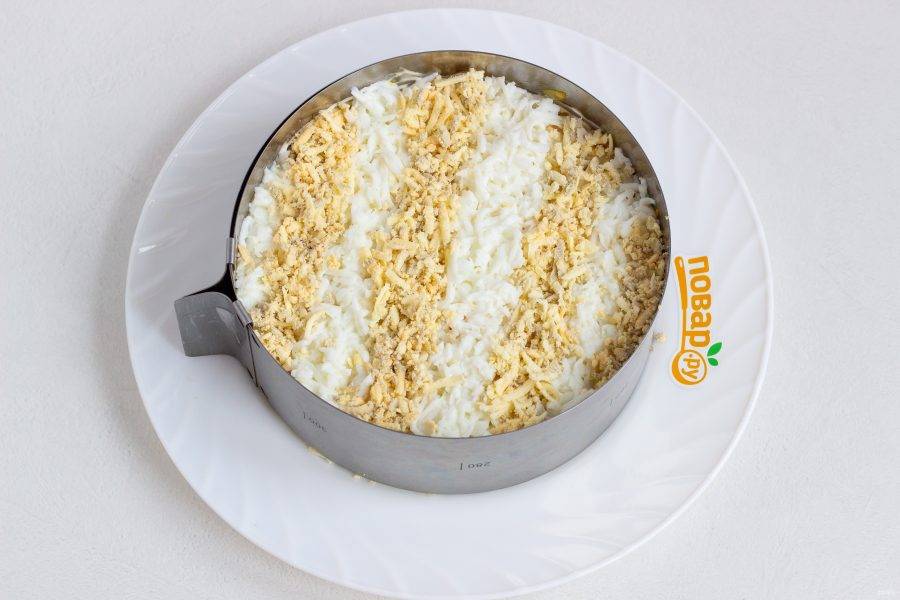 Яйца разделите на белки и желтки, натрите отдельно на мелкой терке и выложите в виде полос на салат. Поставьте салат на 1-2 часа в холодильник, затем аккуратно снимите кольцо.