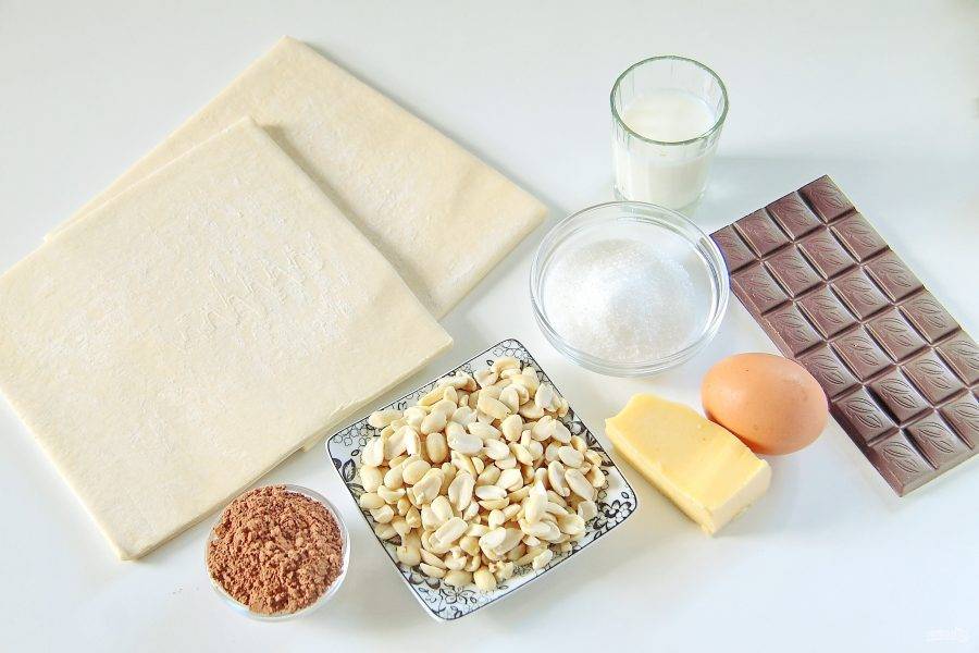 1. Подготовьте все необходимые ингредиенты. Тесто заранее достаньте и разморозьте при комнатной температуре.