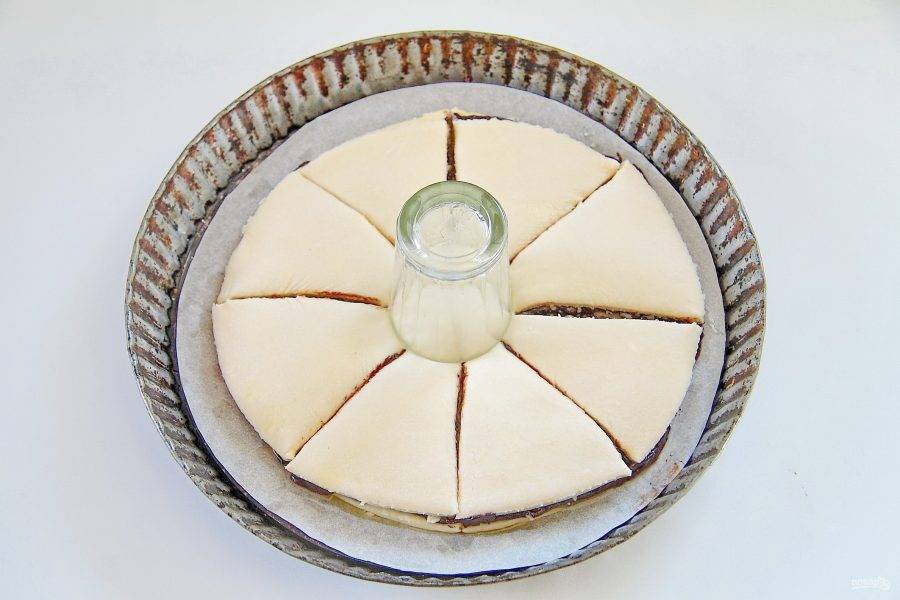 6. Накройте начинку вторым пластом теста. Поставьте по центру бокал и сделайте по кругу надрезы ножом.