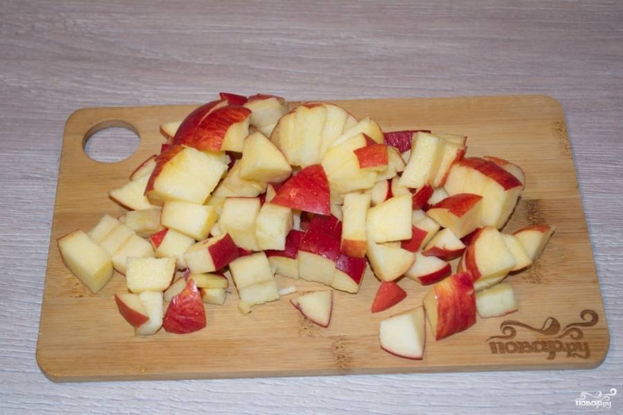 Сладкие красные яблоки нарезаем кубиками. Шкурку можно снимать, а можно и нет. Красная шкурка яблока придает начинке цвет. Яблоки мы будем тушить. Они пустят сок и придадут начинке яркость.