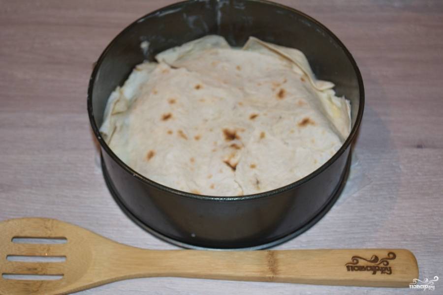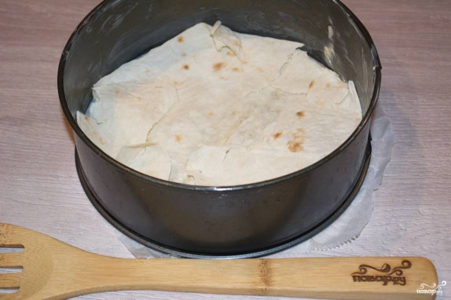 Форму для запекания смажьте сливочным маслом. На дно формы выложите кусочки лаваша, застелив все дно формы.
