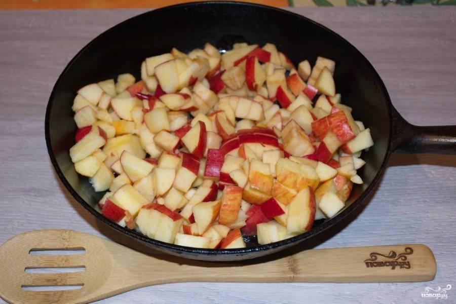 Карамелизируйте яблоки. Помешивайте. Яблоки пустят сок, и он, соединившись с сахаром, превратится в карамель. Добавьте молотую корицу.