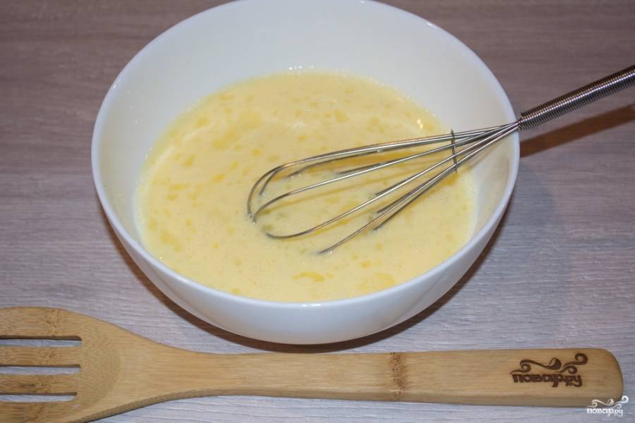 В мисочке взбейте молоко с яйцами. Добавьте сахар, снова взбейте.