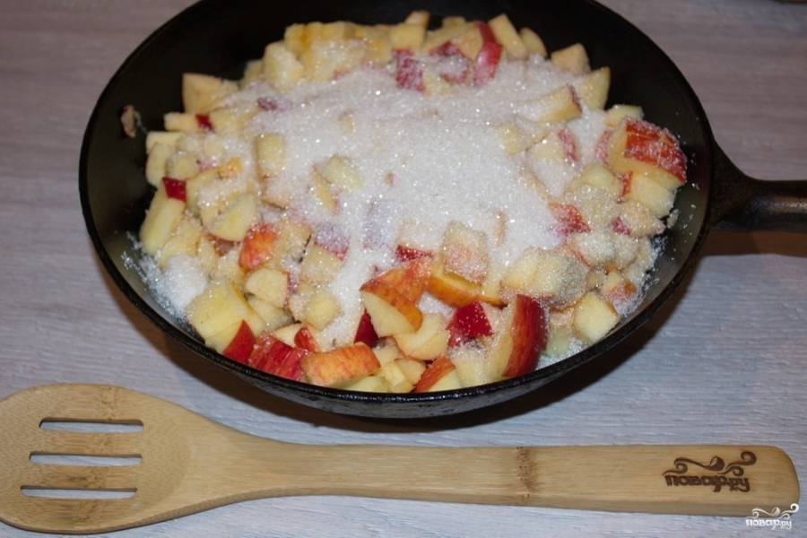В сковороде растопите 50 гр. сливочного масла. Выложите яблоки, посыпьте их сахаром.