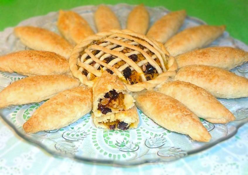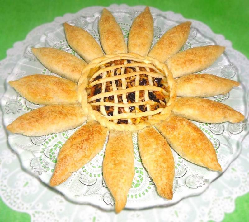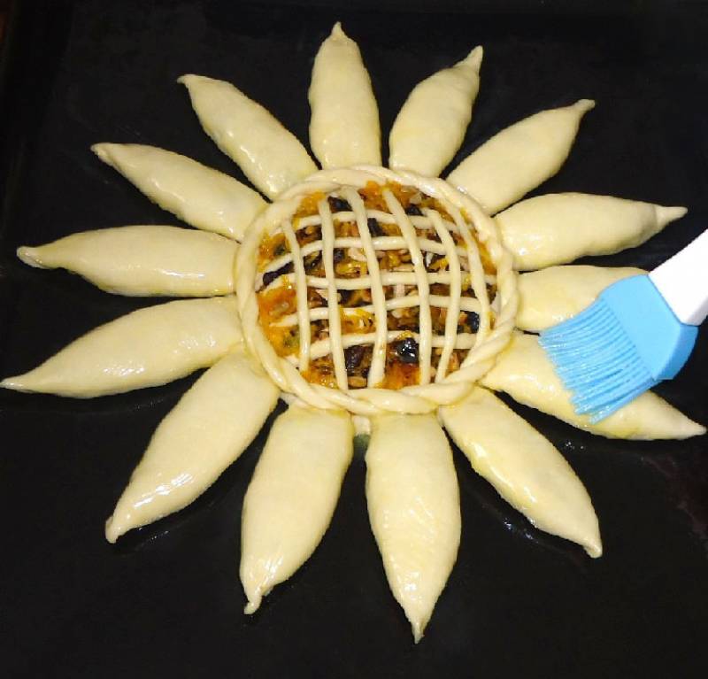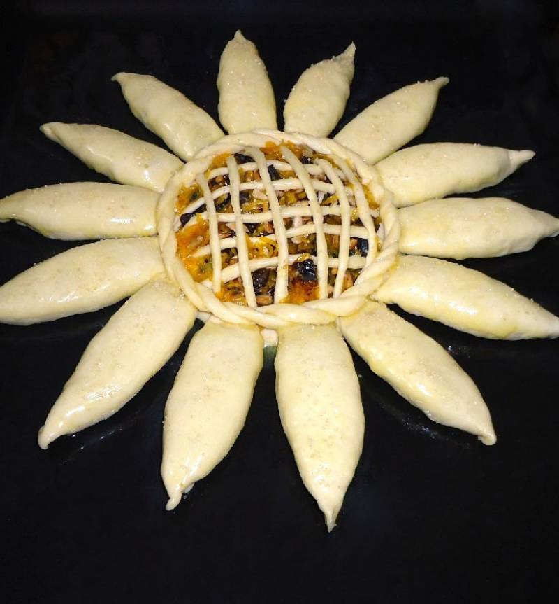 Пирожки - слойки выложить на противень в виде лепестков подсолнуха.