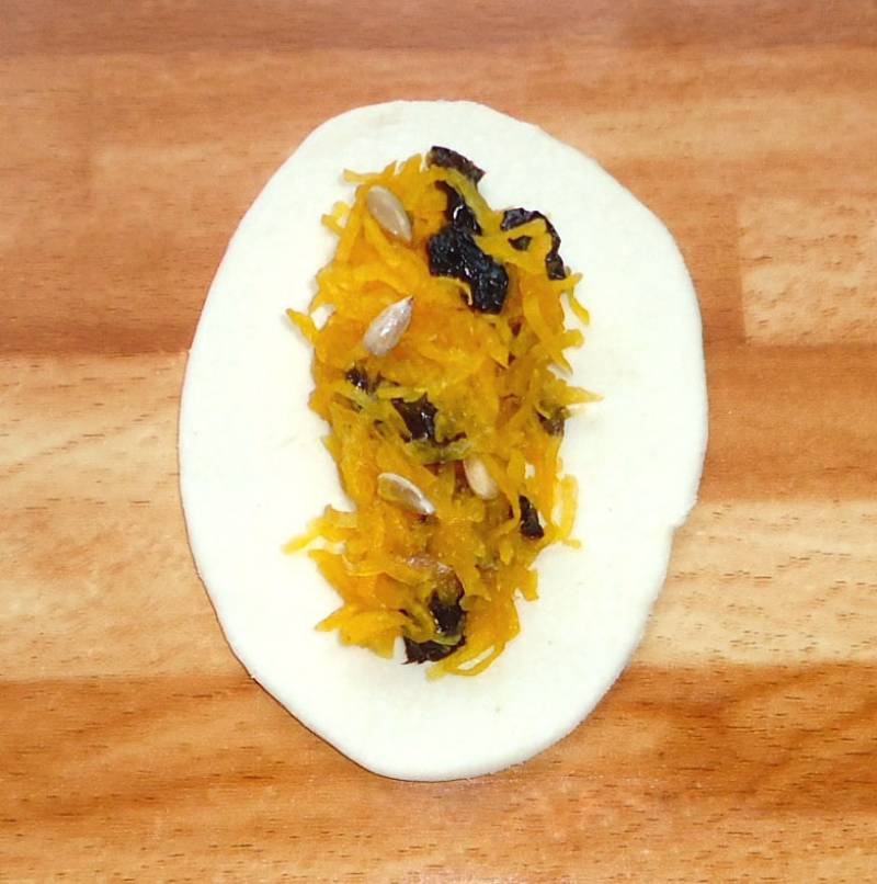 На середину круга, чуть отступив от краёв выложить немного начинки и посыпать семечками.