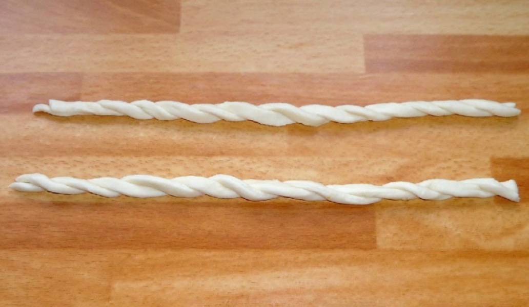 Слоёное тесто раскатать толщиной 2 -3 мм, с помощью формы вырезать один круг диаметром 14 см и 14 кругов диаметром в 2 раза меньше, чем большой круг, то есть 7 см., нарезать несколько полосок из теста.