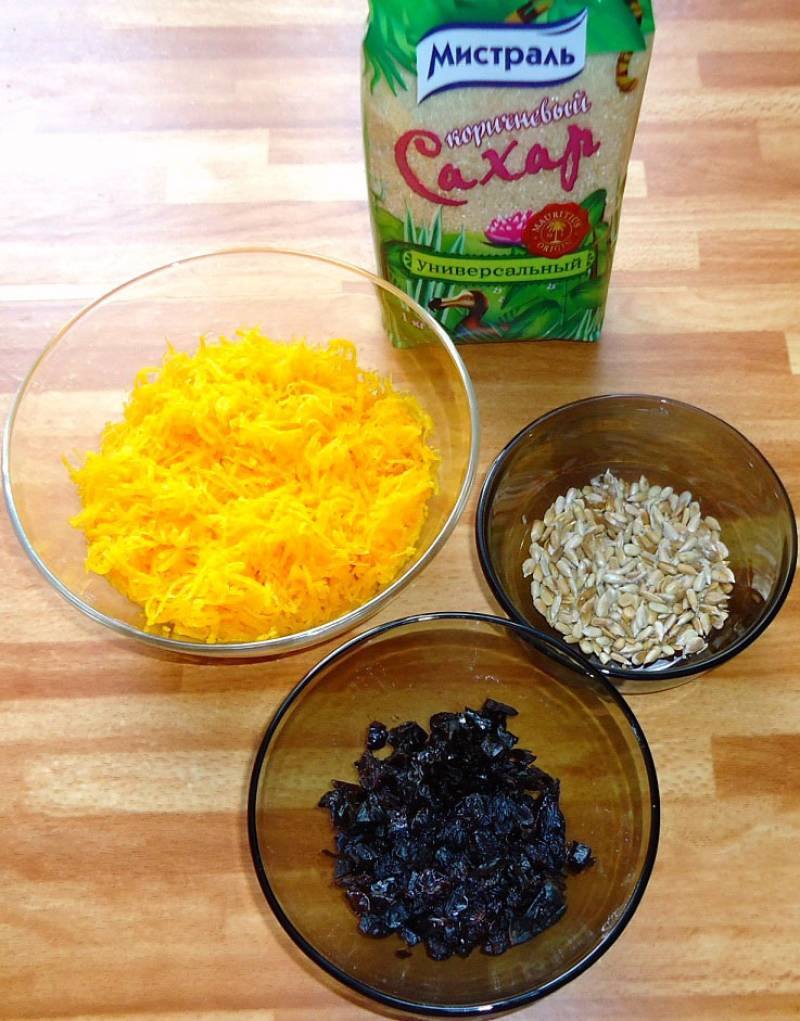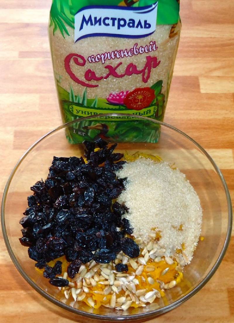 Для начинки тыкву (или яблоки) очистить от кожуры и семян, натереть на средней тёрке, изюм или чернослив (у меня был и изюм и чернослив) промыть, залить кипятком, оставить на 10-15 минут, затем слить воду и мелко нарезать чернослив, семечки подсолнуха слегка обжарить на сухой сковороде и очистить. Для приготовления слоек я использовала универсальный коричневый сахар ТМ "Мистраль".