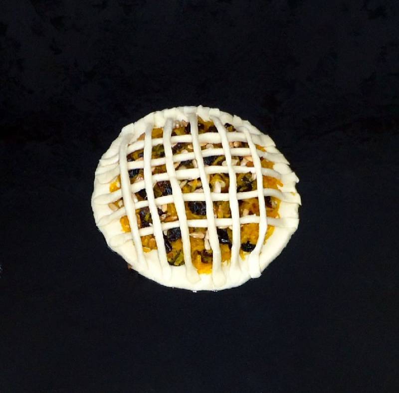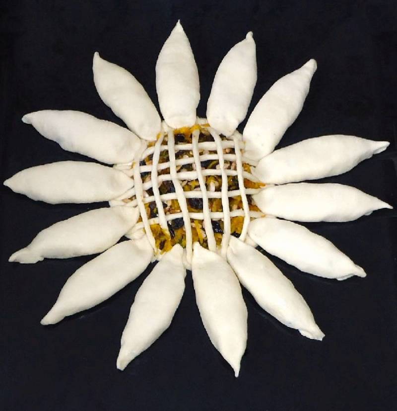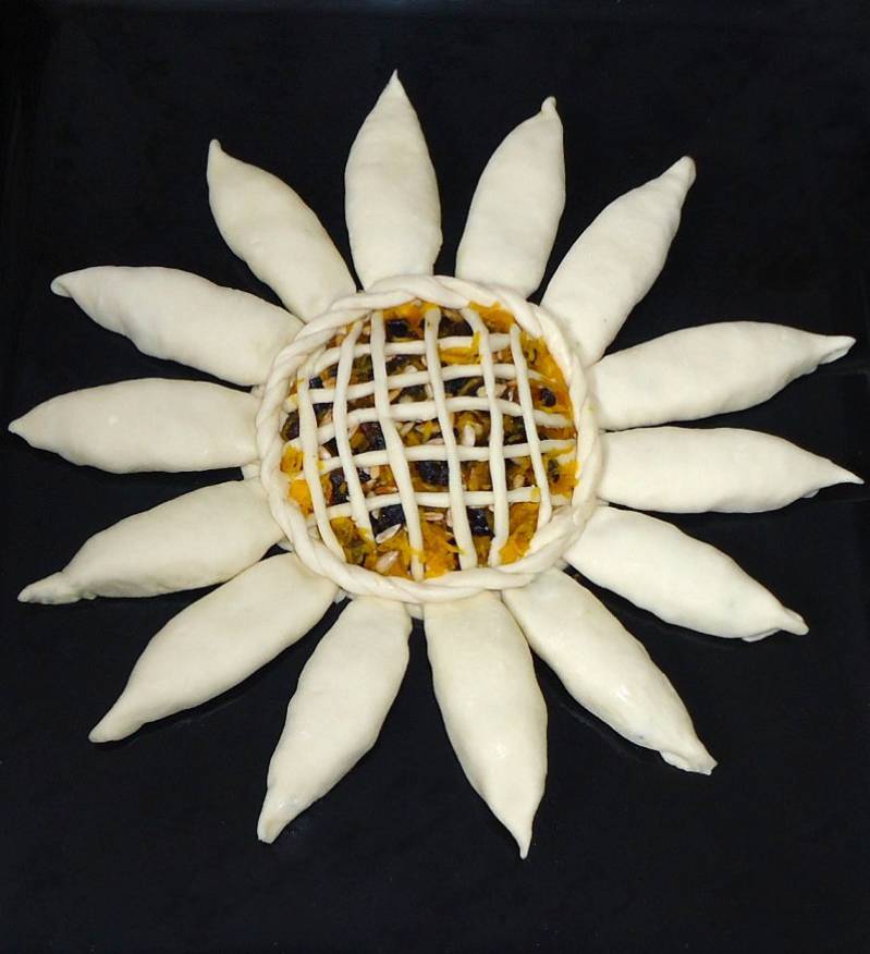 Предлагаю рецепт очень вкусных слоек с тыквой, изюмом и семечками и вариант подачи в виде подсолнуха.