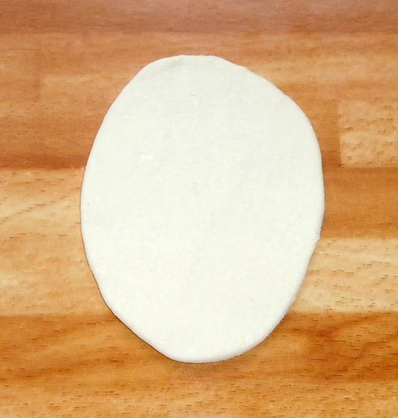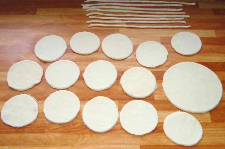 Круги из теста,которые поменьше чуть раскатать в виде овала.