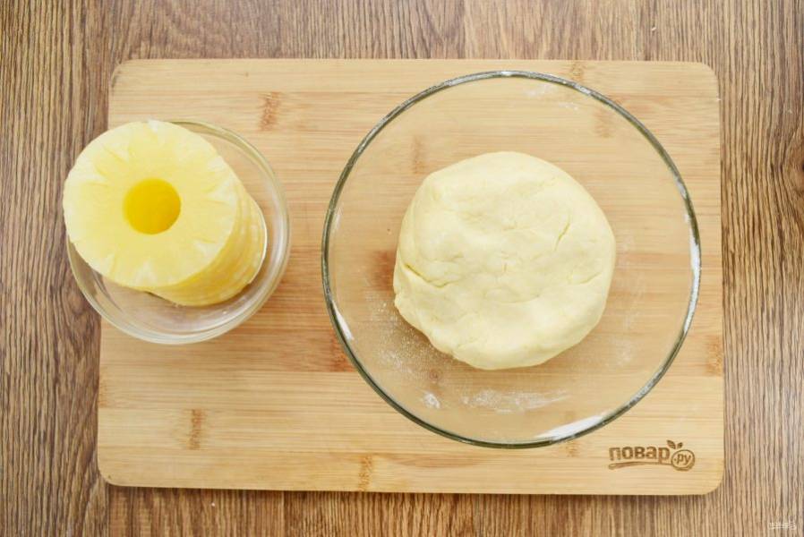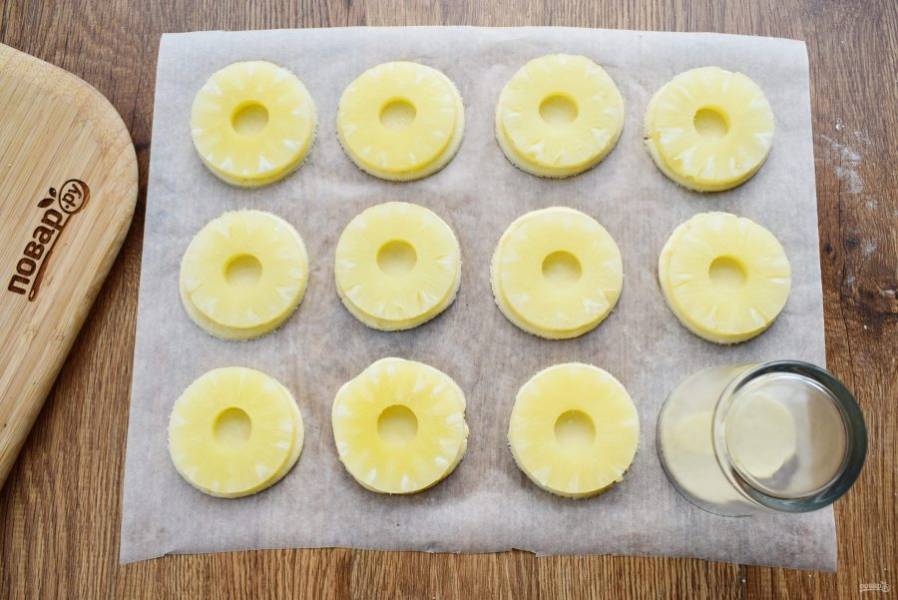 Тесто разделите на 4 части. Раскатайте часть в тонкий пласт, толщиной 3-4 мм. Вырубите кружки, равные по диаметру ананасовым кольцам, разместите их на пергаменте для выпечки. Сухие ананасы положите на кружки теста.