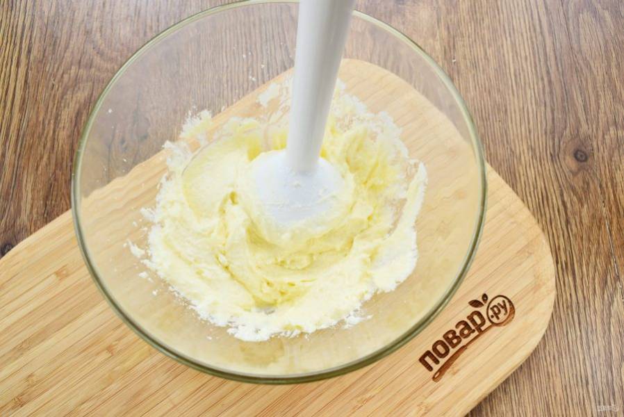 Масло и творог взбейте блендером, добавьте сахар и ванилин, взбейте.