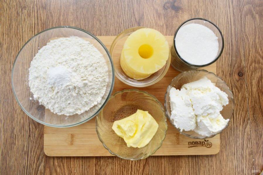 Подготовьте необходимые продукты. Масло заранее достаньте из холодильника, оно должно стать мягким. С консервированного ананаса слейте сироп, обсушите.