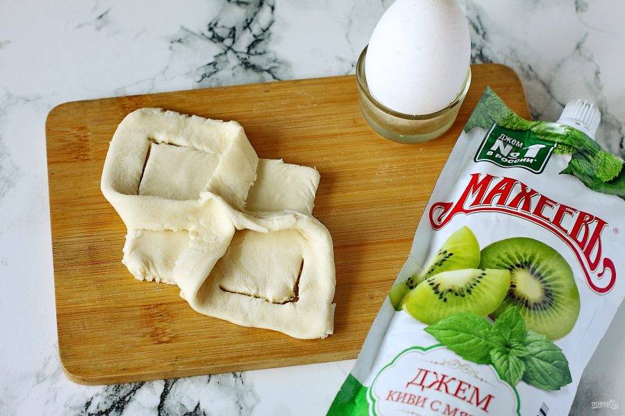 Как правило, слоеное тесто в пачке из двух квадратов. Разрежьте каждый квадрат на 4 части.