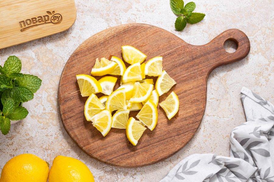 Лимон обдайте кипятком, чтобы убрать лишнюю горечь из кожуры. Нарежьте лимон дольками, удалите косточки.