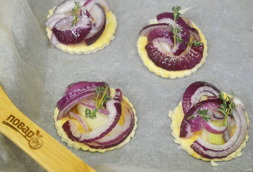 4. Выложите лук на вырезанные круги теста. Добавьте тимьян.
