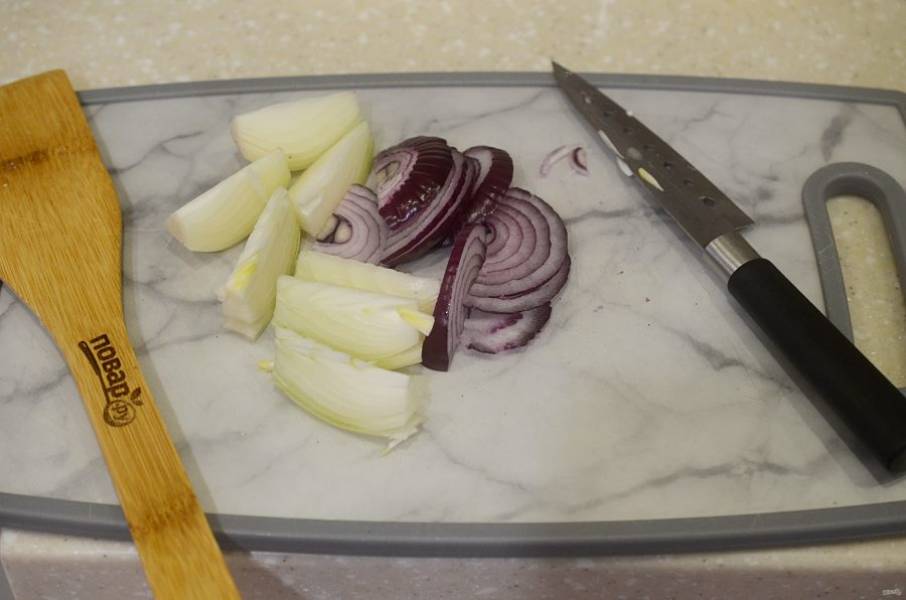 3. Лук почистите. Часть нарежьте полукольцами, часть дольками. Посолите и полейте маслом.
