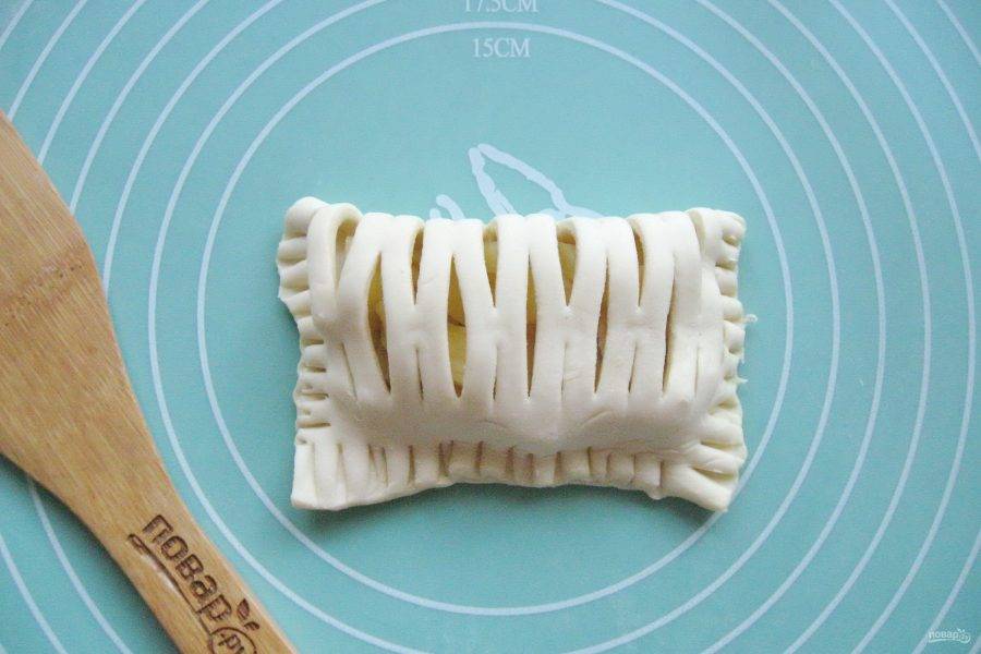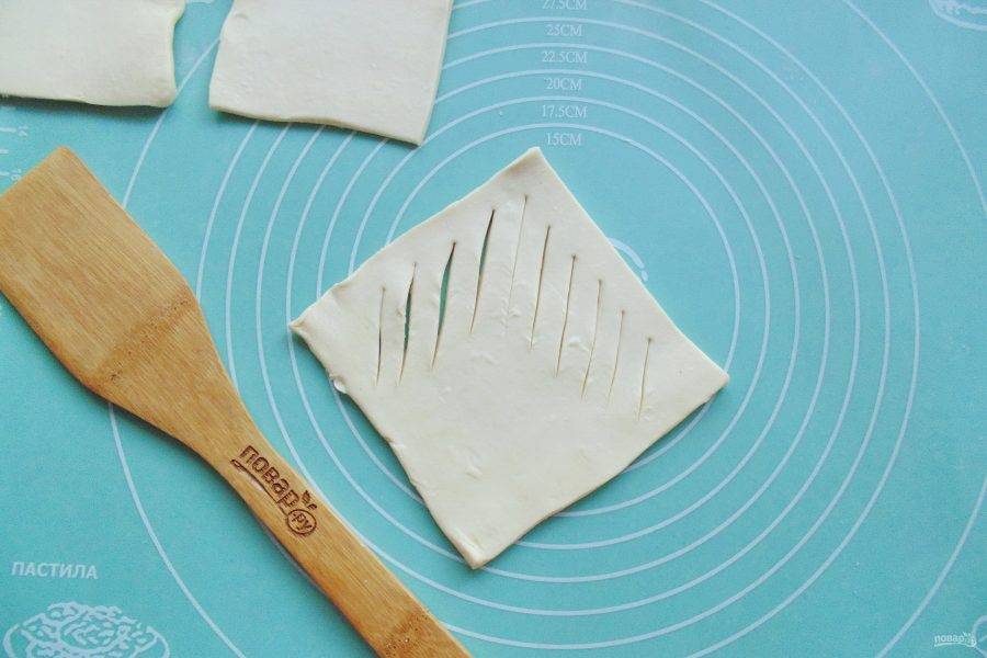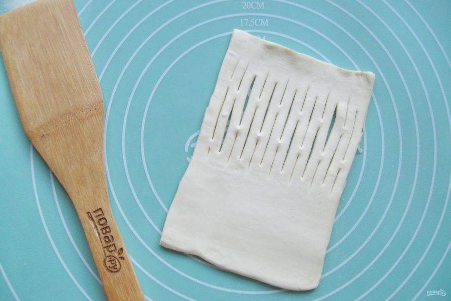 Слегка раскатайте тесто и вырежьте пласт размером 10х15 см. На одной половине специальным валиком или ножом сделайте надрезы.