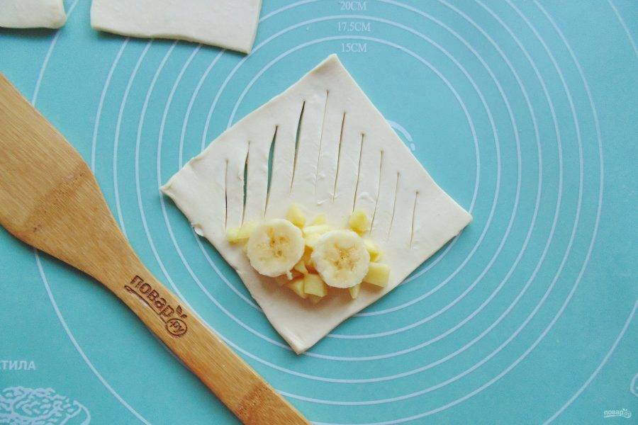 Готовим вкусную и быструю выпечку из слоёного теста, а начинить её можно фруктами, в частности яблоком и бананом. Тем более, что тесто можно приобрести готовое. Слойки подойдут к праздничному столу.