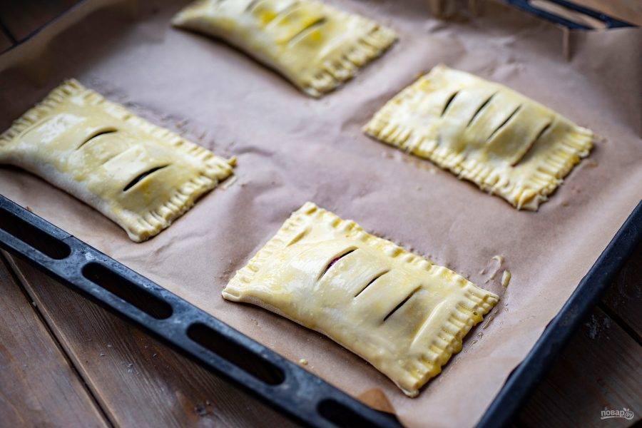 Противень застелите пергаментом для выпечки и выложите все заготовки будущих слоек, смажьте их взболтанным яйцом с помощью кулинарной кисти. Выпекайте слойки с вишней в заранее разогретой до 180 градусов духовке 35 минут.