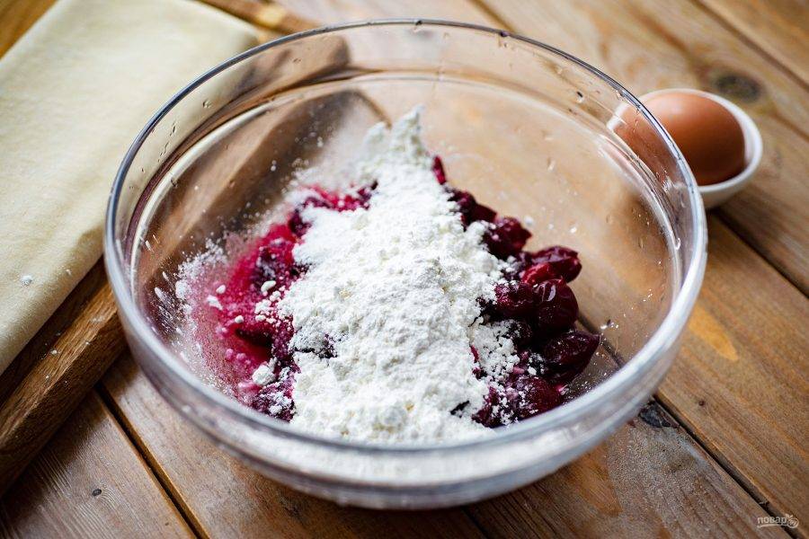Разморозьте замороженную вишню в миске и слейте излишнюю жидкость.
