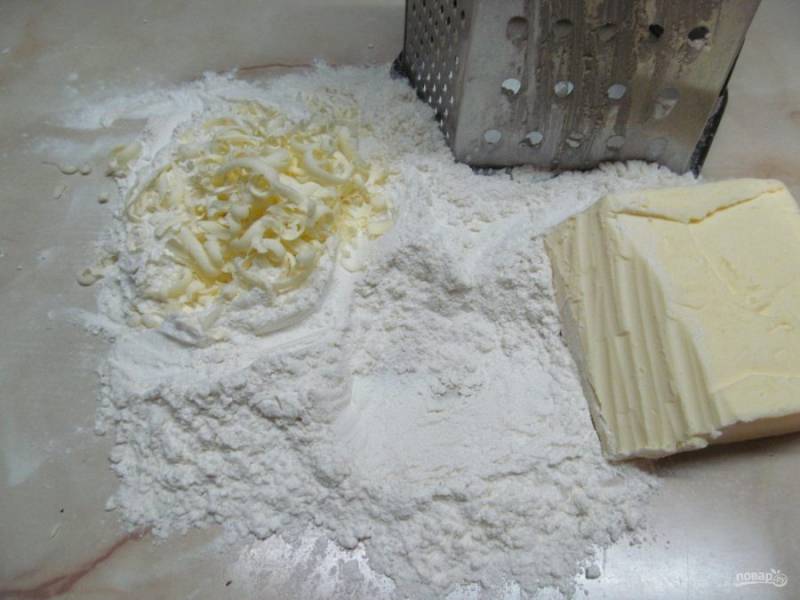 Еще для приготовления теста нужно заморозить сливочное масло. Высыпать муку на рабочую поверхность и начинаем натирать масло на крупную терку. При этом периодически перемешиваем масло с мукой и продолжаем натирать.