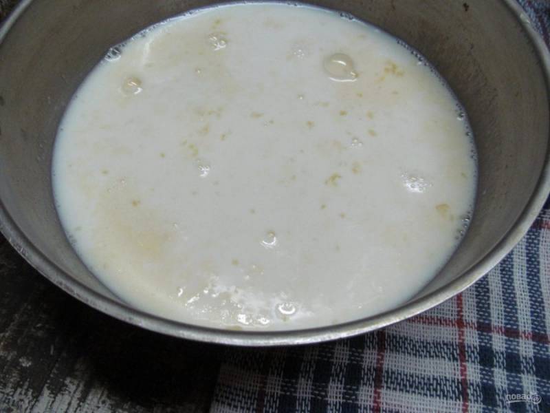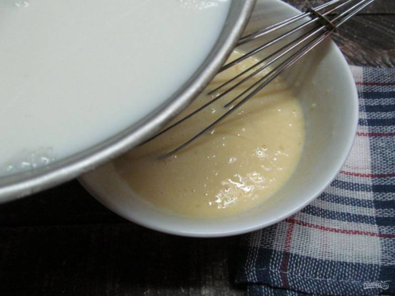 Тонкой струйкой, все время перемешивая, выливаем горячее молоко с сахаром в яично-сахарную смесь.