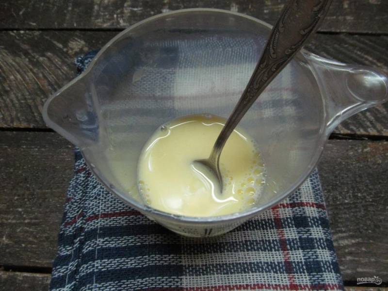 В первую очередь нужно приготовить жидкую смесь для слоеного теста. В мерный стакан влить уксус, добавить яичный желток и соль. перемешать.