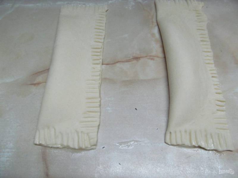 Берем одно яйцо, отделяем белок от желтка. Чуть взбить белок и смазать кисточкой половину прямоугольника (только края).