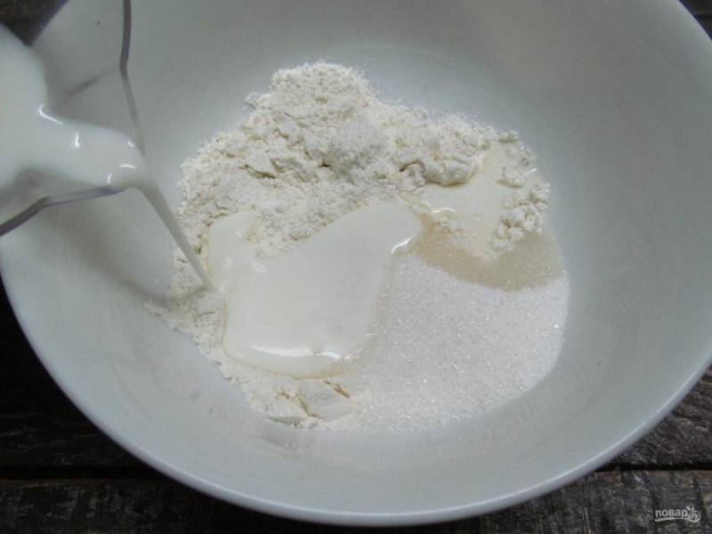Пока тесто в холодильнике приготовим крем для начинки. Муку соединить со щепоткой соли, 50 гр. сахара и влить 100 мл молока. Перемешать все венчиком.