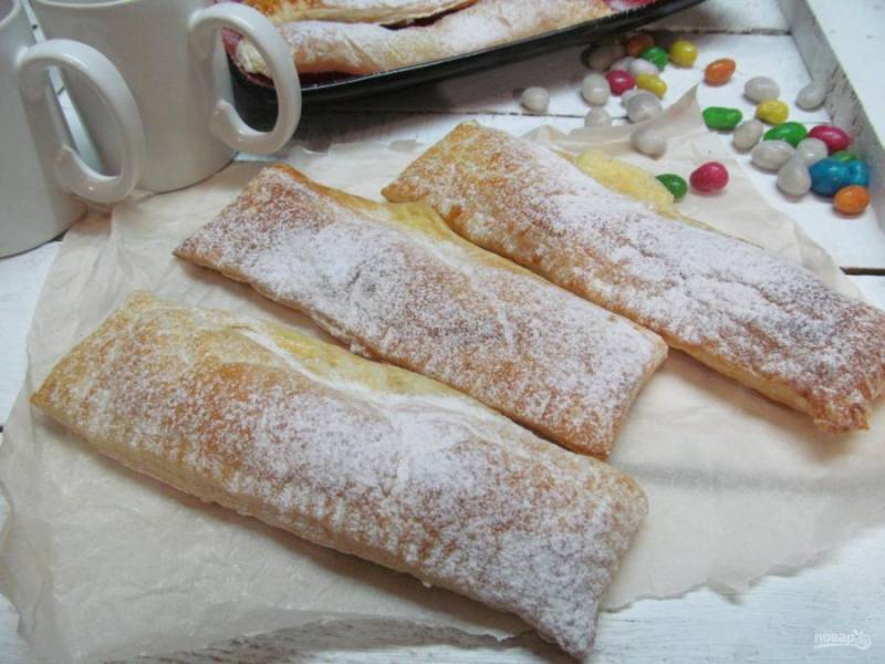 Перед подачей слойки полностью остудить и посыпать сахарной пудрой. Приятного чаепития.