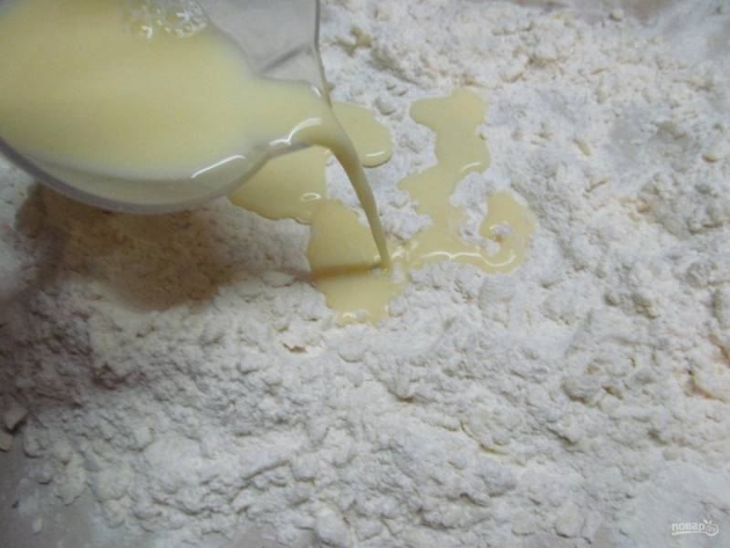 Муку с маслом перемешиваем руками, по центру делаем углубление и выливаем жидкую смесь из холодильника. Быстро все перемешать руками. Тесто не замешиваем, а собираем тесто со всех сторон и накладываем горкой слоями, придавливая ладонями. И таким образом собираем все со стола без остатка.