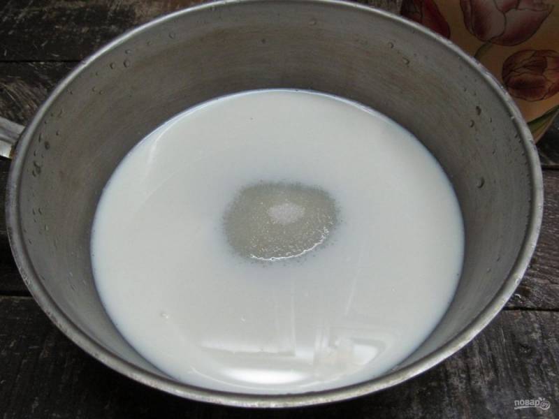 В сотейник выливаем остальное молоко, высыпаем остальной сахар и перемешиваем. Ставим на огонь, доводим до кипения, снимаем с огня.