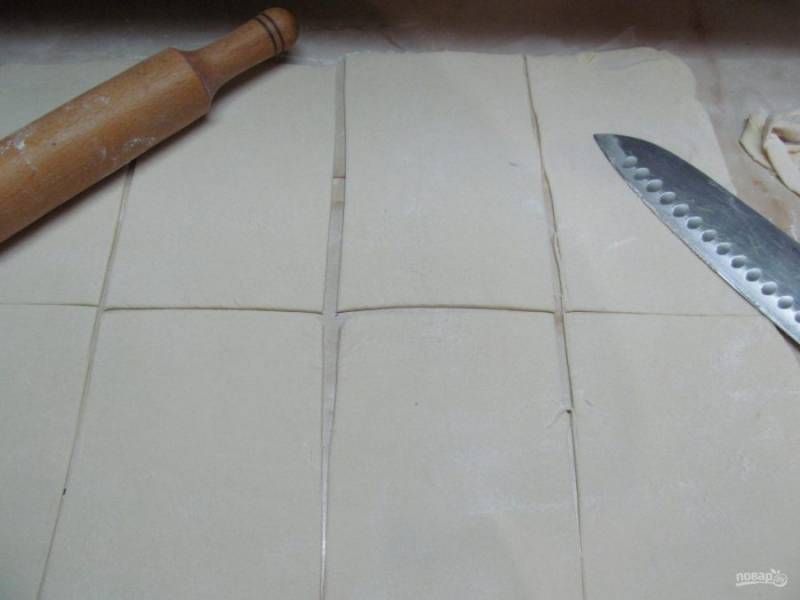 Достаем тесто из холодильника и раскатываем в тонкий пласт толщиной 0,3 см. Отрезать неровные края. Прямоугольник должен быть примерно - 44 на 36 см. разрезать тесто вдоль на 2 части, потом поперек на 2 части и еще каждую на 2 части.