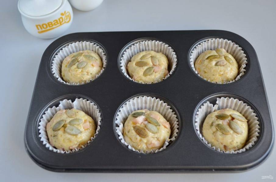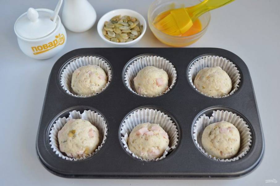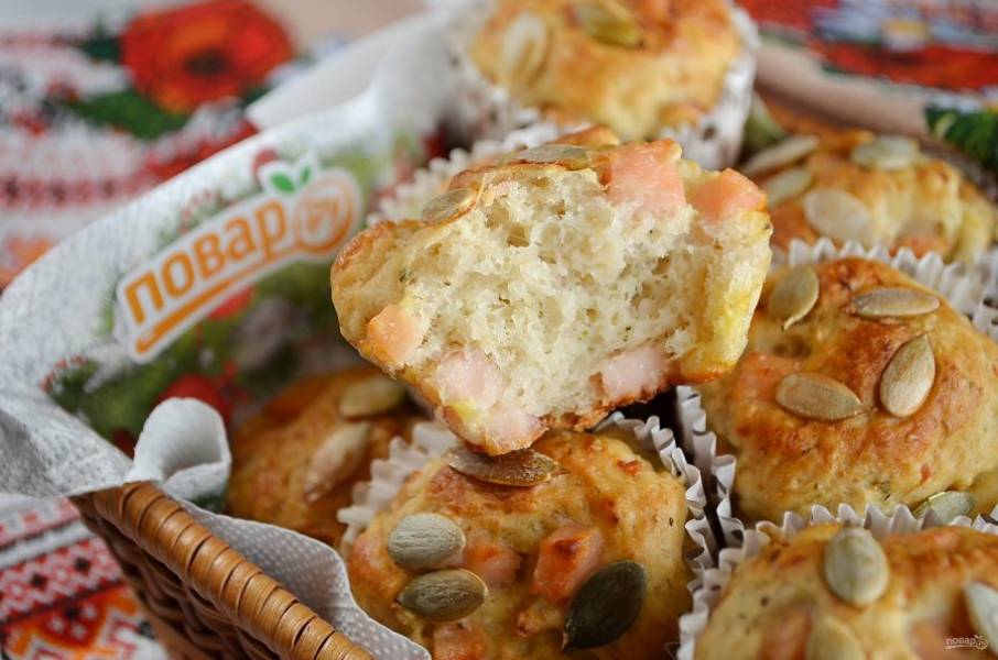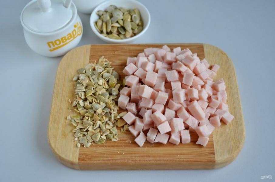 7. Ветчину порежьте кубиками. Часть тыквенных семечек оставьте для украшения булочек, остальные порубите ножом крупно, они пойдут в тесто.