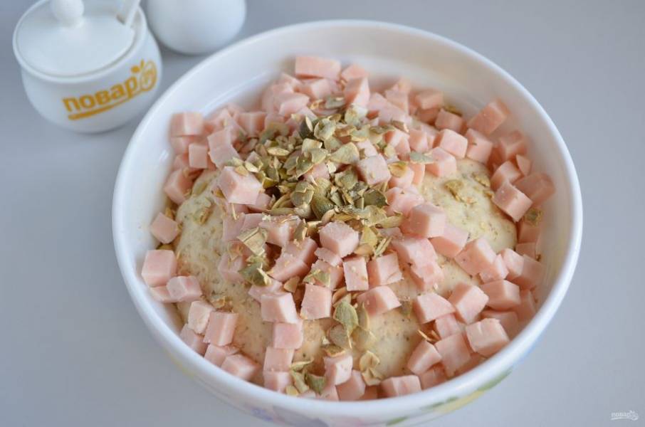 8. Добавьте в тесто ветчину и семечки. Перемешайте.