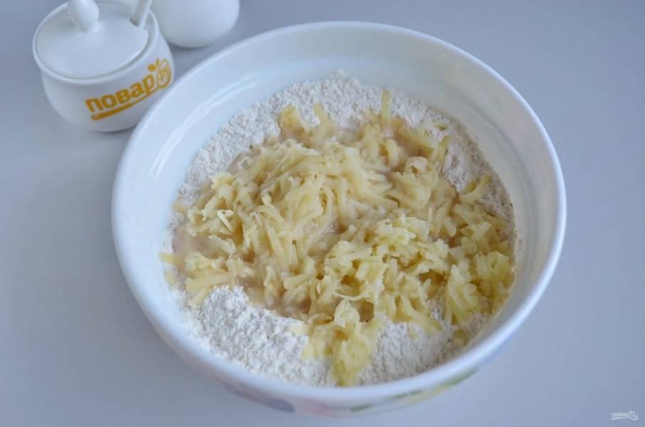 4. В мучную смесь влейте теплую дрожжевую смесь и добавьте тертый картофель. Замесите тесто.