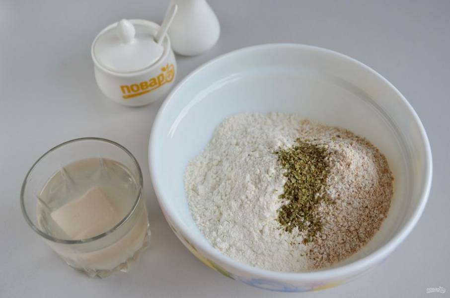 2. В теплой воде растворите соль, сахар и дрожжи. В другой таре соедините муку с отрубями и майораном. Перемешайте.