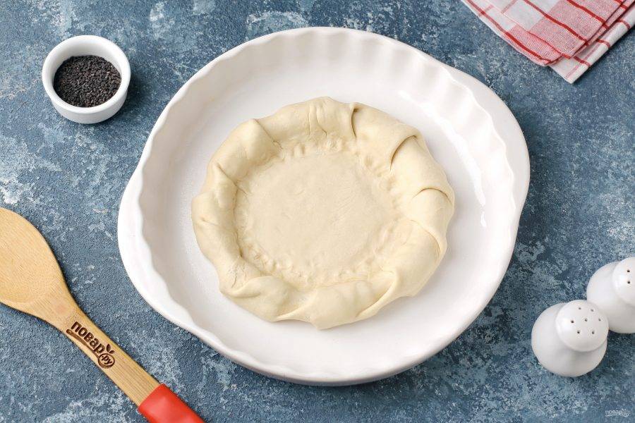 Тесто раскатайте в форме круга и выложите на противень или в жаропрочную форму, смазанную маслом. По кругу, отступив по краям, выложите сосиски.