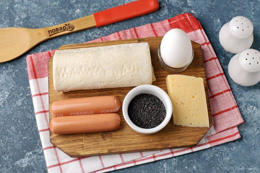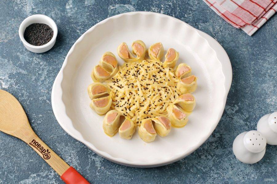 Смажьте тесто желтком, а сыр посыпьте кунжутом. Выпекайте в духовке при температуре 180-200 градусов около 20-25 минут.