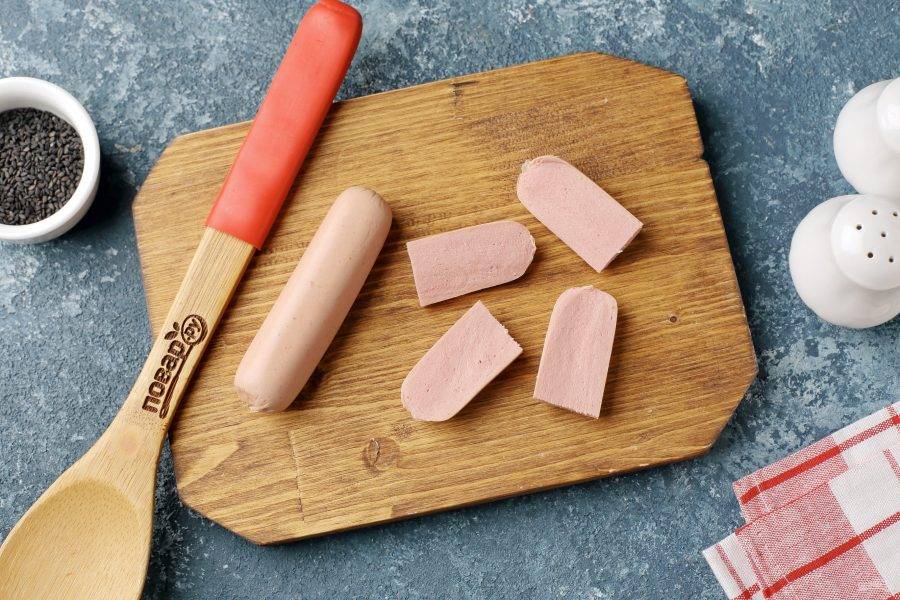 Сосиски разрежьте вдоль на две части, а затем ещё раз пополам, но уже поперёк.