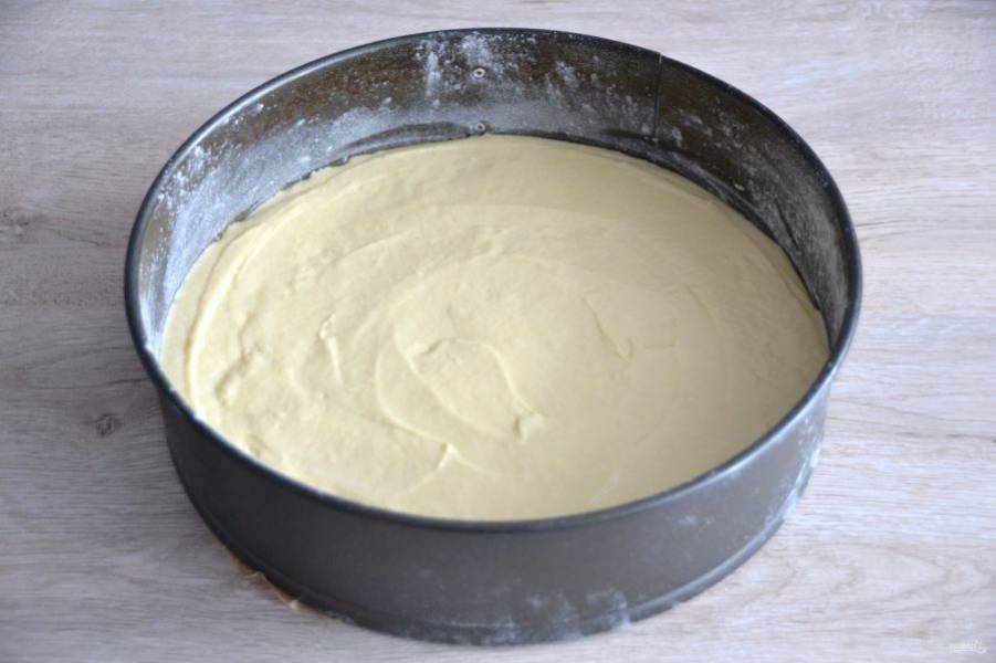 Дно формы для запекания застелите пергаментом, смажьте форму сливочным маслом и слегка присыпьте мукой, излишки муки стряхните. Выложите тесто в подготовленную форму, разровняйте. Выпекайте в духовке при температуре 180 градусов примерно 45 минут. Готовность можно проверить деревянной зубочисткой.