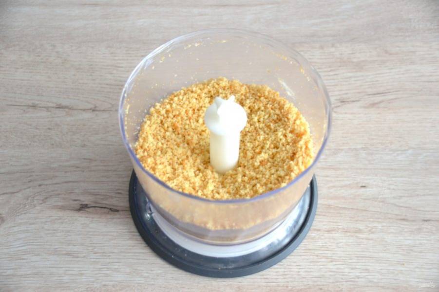 Срезанную часть коржа поломайте на кусочки и поместите в блендер.
