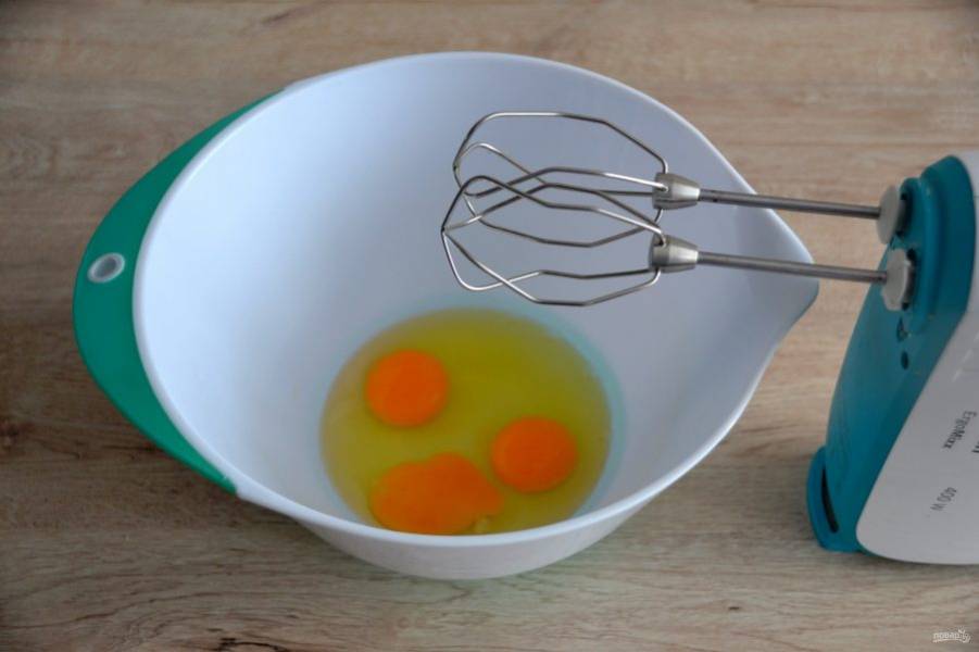 В миску для приготовления теста вбейте яйца и взбейте их до пены.