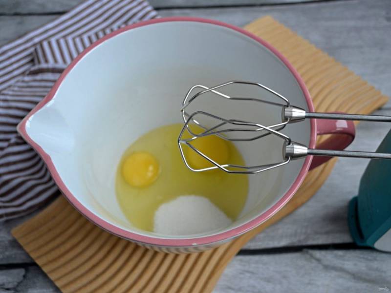 В миске для смешивания вбейте 2 яйца, добавьте 60 грамм сахара, взбейте в пену.