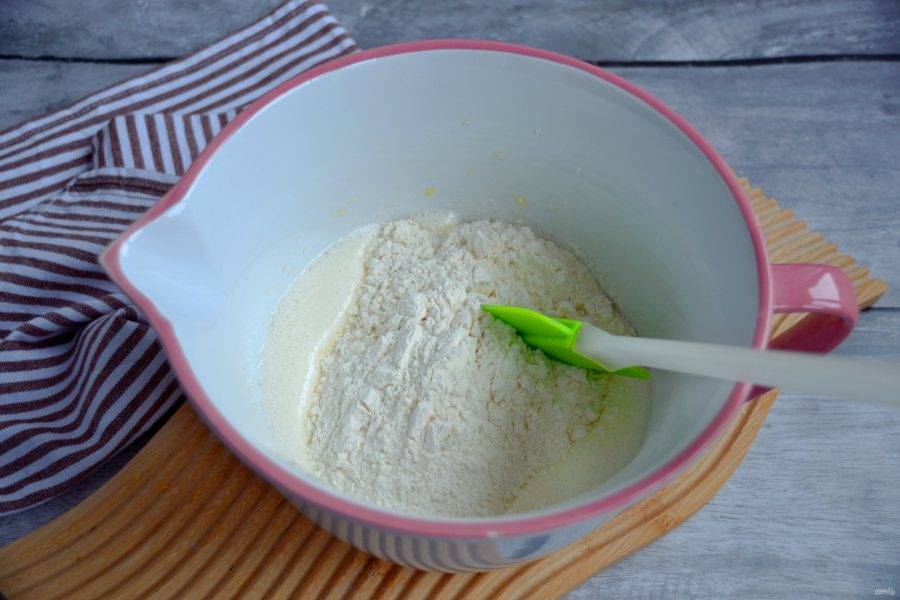 Добавьте сухие ингредиенты к жидким, смешайте силиконовой лопаткой.