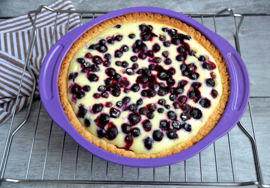 Выложите смородину поверх сметанной начинки. Разогрейте духовку до 180 градусов, выпекайте сметанник до готовности примерно 40 минут. Начинка в горячем сметаннике сначала может слегка подрагивать, но потом она стабилизируется.