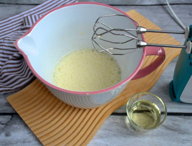 Влейте в яичную смесь растительное масло, снова взбейте.