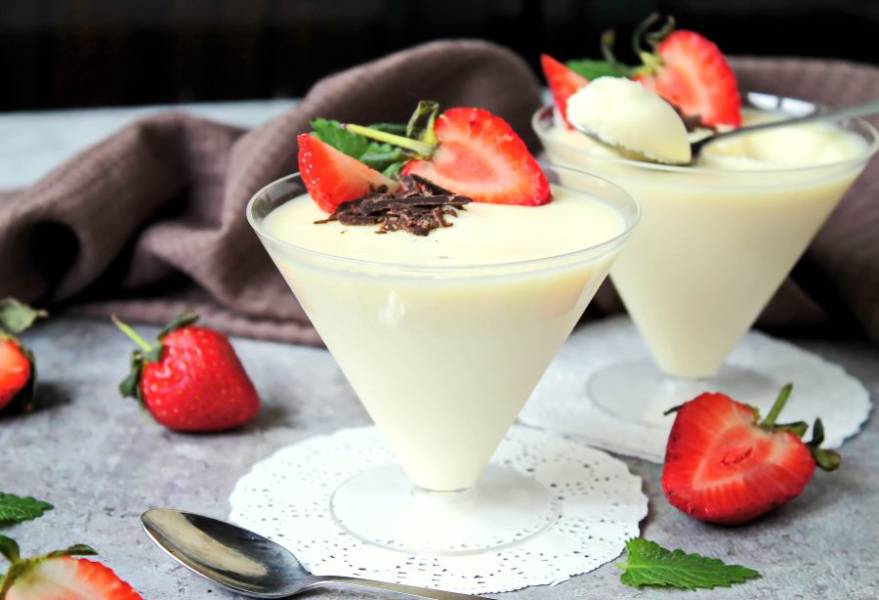 Готовый сметанный крем с белым шоколадом разлейте по креманкам и уберите в холодильник на 4-6 часов для стабилизации. Украсьте готовый крем и подавайте.