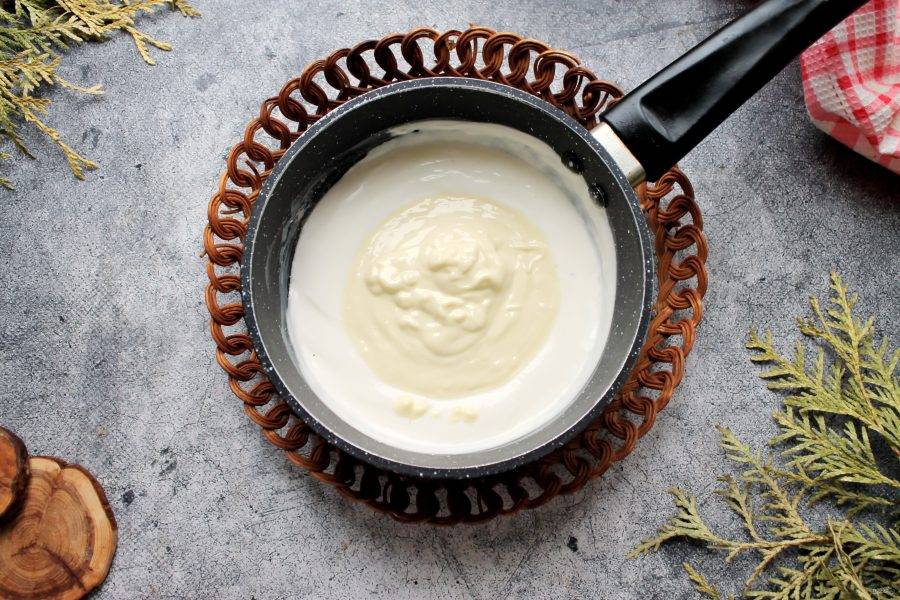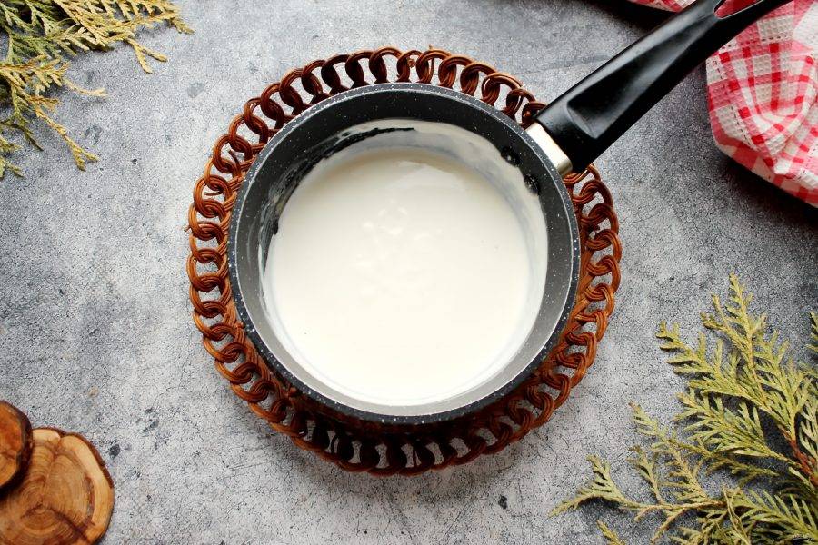 Сметану выложите в сотейник с толстым дном и нагрейте примерно до 55-60 градусов. Снимите с огня.